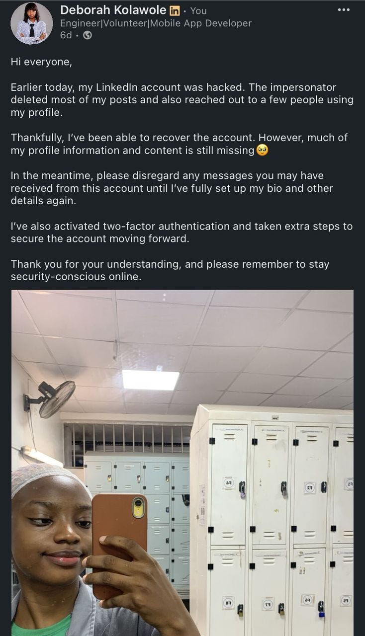 When I got my account back, I made a post to inform my connections about the hack. Not long after, someone reached out to invite me to join his dev team to work on their mobile app. I was excited, he works at my organization, just in a different country, so I trusted him.